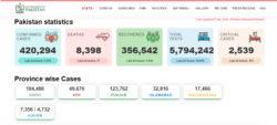 پاکستان میں کرونا کیسز کی کل تعداد چار لاکھ 20 ہزار سے زیادہ ہے جن میں سے تین لاکھ 56 ہزار سے زیادہ مریض صحت یاب ہو چکے ہیں۔