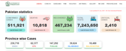 سرکاری اعداد و شمار کے مطابق پاکستان میں عالمی وبا سے ہلاکتوں کی مجموعی تعداد 10 ہزار 818 ہو چکی ہے جب کہ اب تک پانچ لاکھ گیارہ ہزار سے زیادہ کیسز رپورٹ ہو چکے ہیں۔