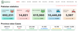 سرکاری اعداد و شمار کے مطابق ملک بھر میں کرونا کیسز کی تعداد چھ لاکھ 92 ہزار سے زیادہ ہے جب کہ چھ لاکھ 15 ہزار سے زیادہ مریض صحت یاب ہو چکے ہیں۔