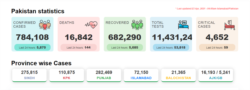عالمی وبا سے پاکستان میں اب تک 16 ہزار 842 مریض ہلاک جب کہ سات لاکھ 84 ہزار سے زیادہ کیسز رپورٹ ہو چکے ہیں۔ ملک میں ایکٹو کیسز کی تعداد 84 ہزار 976 ہے۔