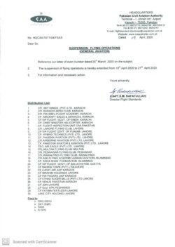 پاکستان میں 25 مارچ سے فضائی آپریشن معطل ہے اور ابتدائی طور پر یہ معطلی 10 اپریل تک تھی۔ تاہم اب سول ایوی ایشن اتھارٹی نے فلائٹ آپریشن پر عائد پابندی میں 21 اپریل تک توسیع کر دی ہے۔