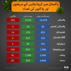 اموات اور مریضوں کی تعداد میں اضافے کے بعد ملک بھر میں مجموعی ہلاکتیں 301 ہو گئی ہیں جب کہ مریضوں کی تعداد 14 ہزار سے زائد ہے۔ صوبہ پنجاب میں کرونا کے سب سے زیادہ کیسز رپورٹ ہوئے ہیں جن کی تعداد 5640 ہے۔