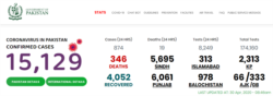 پاکستان میں کرونا وائرس کے کیسز کی مجموعی تعداد 15 ہزار سے تجاوز کر گئی ہے جب کہ اس وبا سے مرنے والوں کی تعداد 346 تک پہنچ چکی ہے۔