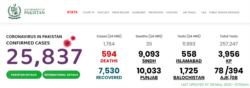 پاکستان بھر میں کرونا وائرس سے 594 افراد ہلاک اور 25 ہزار 837 افراد میں وائرس کی تشخیص ہوئی ہے۔ پاکستان میں کرونا وائرس کے شکار 7530 افراد صحت یاب بھی ہو چکے ہیں۔
