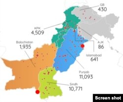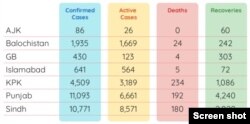 سب سے زیادہ کیسز پنجاب میں 11093 ہے جب کہ سندھ میں کیسز کی تعداد 10771 ہے۔ حکام نے خیبر پختونخوا میں 4509 افراد، بلوچستان میں 1935، اسلام آباد میں 641، گلگت بلتستان میں 430 جب کہ پاکستان کے زیر انتظام کشمیر میں 86 افراد میں وائرس کی تصدیق کی ہے۔