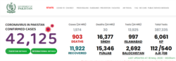 سرکاری اعداد و شمار کے مطابق ملک بھر میں گزشتہ 24 گھنٹوں کے دوران کرونا وائرس کے مزید 1974 نئے کیسز سامنے آئے ہیں۔ اس وبا سے پاکستان میں متاثر ہونے والوں کی تعداد 42 ہزار 125 تک پہنچ گئی ہے۔