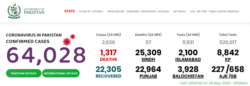 سرکاری اعداد و شمار کے مطابق پاکستان میں کرونا وائرس سے اموات کی تعداد 1317 ہو گئی ہے جب کہ اس وائرس سے 64 ہزار 28 افراد متاثر ہوئے ہیں جن میں سے 22 ہزار 305 صحت یاب ہو چکے ہیں۔