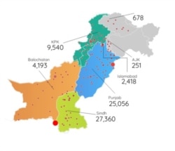 پاکستان میں وبا سے متاثرہ سب سے زیادہ افراد کی تعداد سندھ میں 27ہزار سے زائد ہے جب کہ پنجاب میں 25ہزار، خیبر پختونخوا میں نو ہزار پانچ سو، بلوچستان میں چار ہزار، اسلام آباد میں 2400۔ گلگت بلتستان میں 678 اور پاکستان کے زیر انتظام کشمیر میں251 افراد کے وائرس سے متاثر ہونے کی تصدیق کی گئی ہے۔