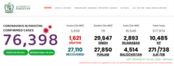سرکاری اعداد و شمار کے مطابق ملک بھر میں کرونا وائرس سے ہلاکتوں کی تعداد 1621 تک پہنچ گئی ہے۔ اس وبا سے متاثر ہونے والوں کی مجموعی تعداد 76 ہزار 398 ہے جس میں سے 27 ہزار 110 صحت یاب ہو چکے ہیں۔