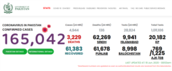 پاکستان میں گزشتہ چوبیس گھنٹوں میں مزید 4944 افراد میں وائرس کی تشخیص ہوئی ہے۔ اس طرح ملک بھر میں کرونا وائرس سے متاثرہ افراد کی تعداد ایک لاکھ 65 ہزار 42 تک پہنچ گئی ہے جن میں سے 61 ہزار 383 افراد صحت یاب بھی ہو چکے ہیں۔