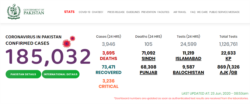 سرکاری اعداد و شمار کے مطابق ملک بھر میں 3946 افراد میں وائرس کی تشخیص ہوئی ہے۔ اس طرح پاکستان میں کرونا وائرس سے متاثر ہونے والوں کی کل تعداد ایک لاکھ 85 ہزار 32 ہو گئی ہے جن میں سے 73 ہزار 471 صحت یاب ہو چکے ہیں۔