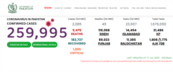 سرکاری اعداد و شمار کے مطابق پاکستان میں کرونا وائرس سے ہلاکتوں کی کل تعداد 5475 ہو گئی ہے اور کیسز کی تعداد ایک لاکھ 59 ہزار 995 تک پہنچ گئے ہیں جن میں سے ایک لاکھ 83 ہزار 737 مریض صحت یاب بھی ہو چکے ہیں۔