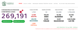 سرکاری اعداد و شمار کے مطابق پاکستان میں کرونا سے ہلاکتوں کی کل تعداد 5709 ہو گئی ہے۔ اس وبا کے کیسز کی کل تعداد دو لاکھ 69 ہزار 191 ہے جن میں سے دو لاکھ 13 ہزار 175 مریض صحت یاب ہو چکے ہیں۔