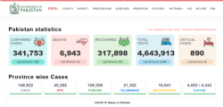 سرکاری اعداد و شمار کے مطابق پاکستان میں عالمی وبا سے اب تک 6943 اموات اور تین لاکھ 41 ہزار 753 کیسز رپورٹ ہو چکے ہیں۔
