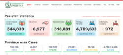 پاکستان میں گزشتہ چوبیس گھنٹوں کے دوران 1650 افراد میں کرونا وائرس کی تشخیص ہوئی ہے۔ اس طرح پاکستان میں کرونا کیسز کی کل تعداد تین لاکھ 44 ہزار سے زیادہ ہو گئی ہے۔