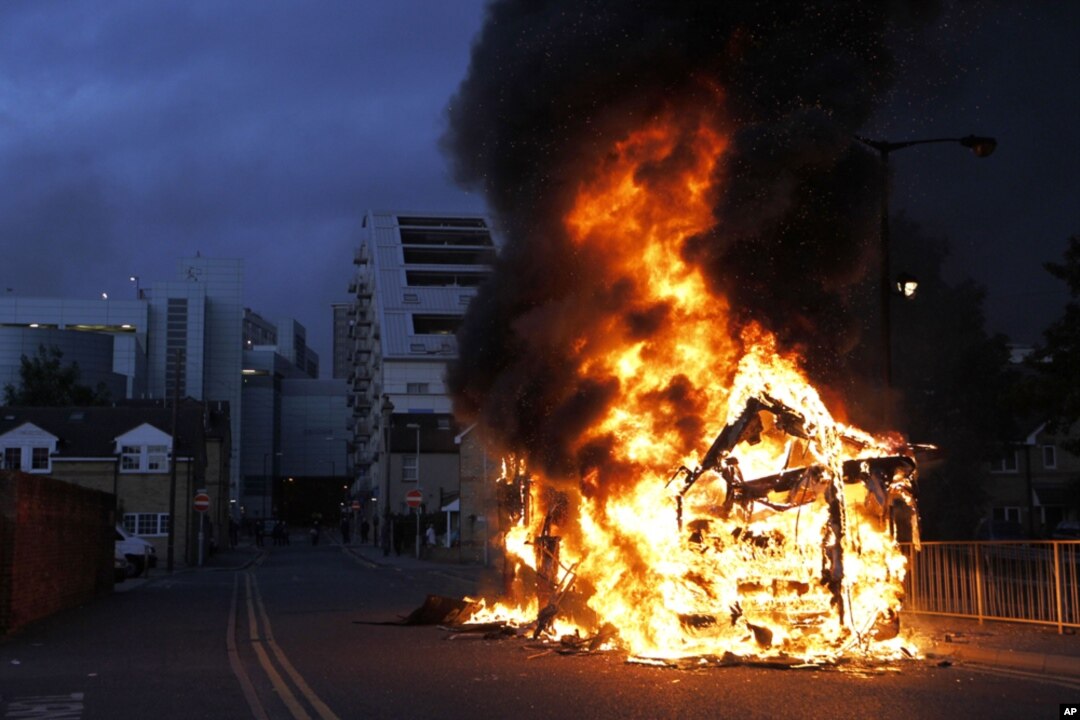 A bus is set on fire as rioters gathered in Croydon, south London, Monday, Aug. 8, 2011. Violence and looting spread across some of London's most impoverished neighborhoods on Monday, with youths setting fire to shops and vehicles, during a third day of r