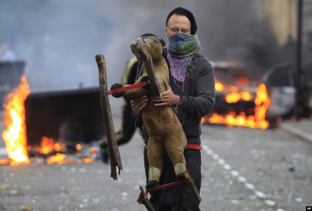 A masked man carries a toy backdropped by a burning car and garbage bins set on fire by rioters in Hackney, east London, Monday Aug. 8, 2011. Youths set fire to shops and vehicles in a host of areas of London _ which will host next summer's Olympic Game