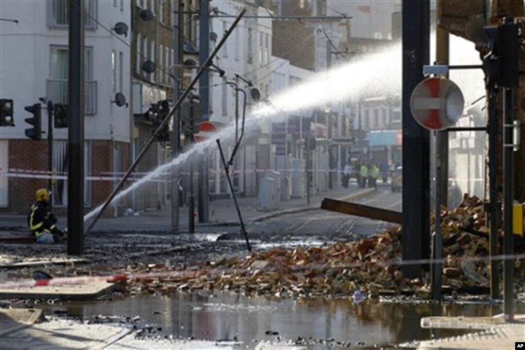 A firefighter sprays water onto the furniture store set on fire by rioters last night in Croydon, south London, Tuesday, Aug. 9, 2011. A wave of violence and looting raged across London and spread to three other major British cities Tuesday, as authoritie