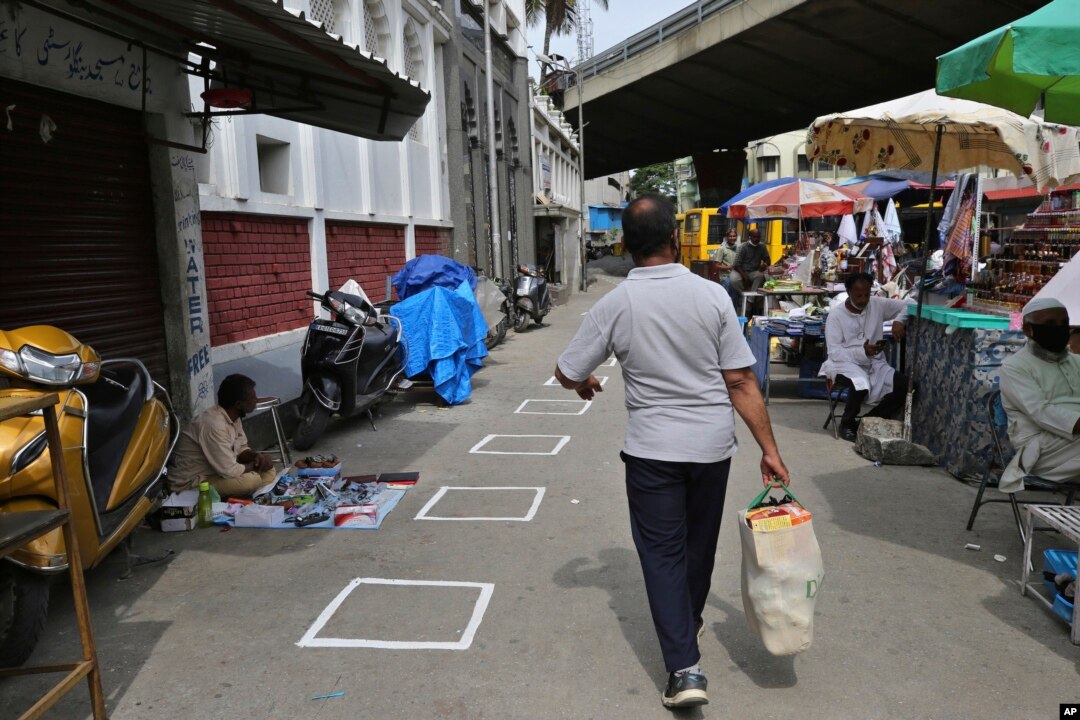 بھارتی شہر بنگلور میں بھی بازار اور شاپنگ مالز کھل گئے ہیں۔ بازاروں میں سماجی دوری برقرار رکھنے کے لیے دکانوں کے باہر نشانات لگائے گئے ہیں۔