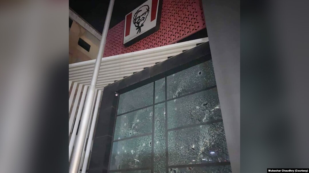 مبشر چوہدری کے مطابق پولیس کی جانب سے مظاہرین کو روکے جانے پر مشتعل مظاہرین نے کے ایف سی میں توڑ پھوڑ شروع کر دی اور بعدازاں آگ لگا دی۔